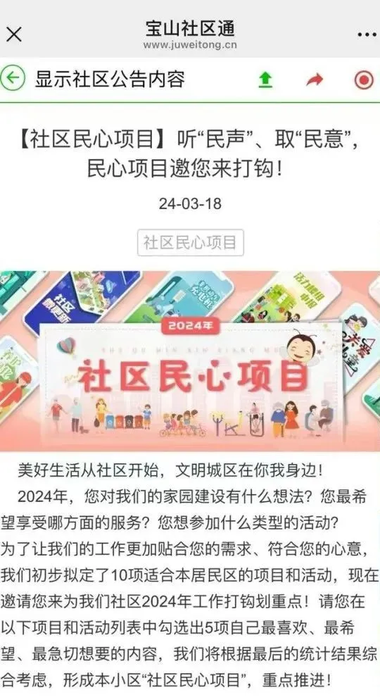 小区内的各类重大事项通过听证会、协调会、评议会“三会”机制进行,推出“社区民心项目居民打钩”计划。聚焦听民声、取民意,激发居民参与社区治理的积极性,涵盖参与式微更新改造、树木绿化规范修剪、为老便民服务、消防安全隐患等方面。依据居民意愿制定方案,在改造方案形成过程中践行全过程人民民主,通过党员大会、居民议事会、社区通等平台线上线下广泛征求意见。参与式微更新项目成功激发了居民的参与热情,满足了居民的多样化需求。