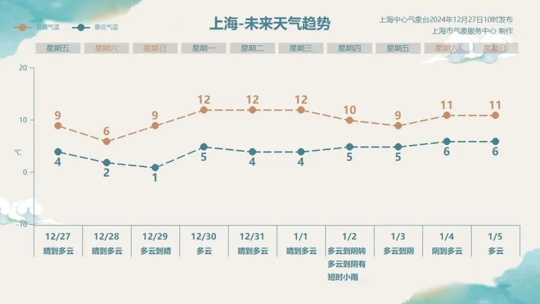 上海市气象局服务首席邬锐告诉记者:“周日可能会出现这一次冷空气影响过程的极端最低温,市区只有1℃左右,部分郊区在零下5℃到零下3℃,有冰冻或者严重冰冻,不过因为阳光比较好,所以气温上升比较快,周日的最高气温可以上升到9℃左右。现在来看,下周的上半周以晴冷天气为主,跨年期间还会回暖,天气也比较好,大家可以安排一些活动,不过气温有所起伏震荡,大家要注意适时调整着装,谨防感冒。”