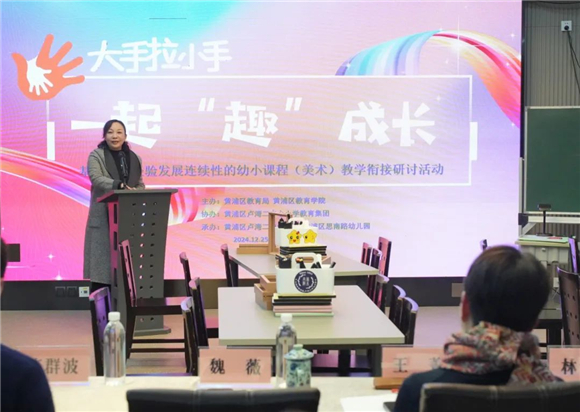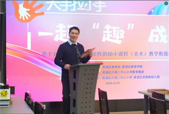 12月25日下午,“大手拉小手一起‘趣’成长”——基于儿童经验发展连续性的幼小课程(美术)教学衔接研讨活动在黄浦区卢湾二中心小学顺利举行。上海市教师教育学院(上海市教育委员会教学研究室)学前教研员王菁、综合教研员陈群波莅临指导,黄浦区教育学院党总支书记、副院长魏薇,区教育局、区教育学院相关科室负责人,幼小衔接项目组相关教研员,卢湾二中心小学、思南路幼儿园校领导以及区各小学、幼儿园教师代表参加活动。本次研讨活动由卢湾二中心小学副校长施颖琼主持。