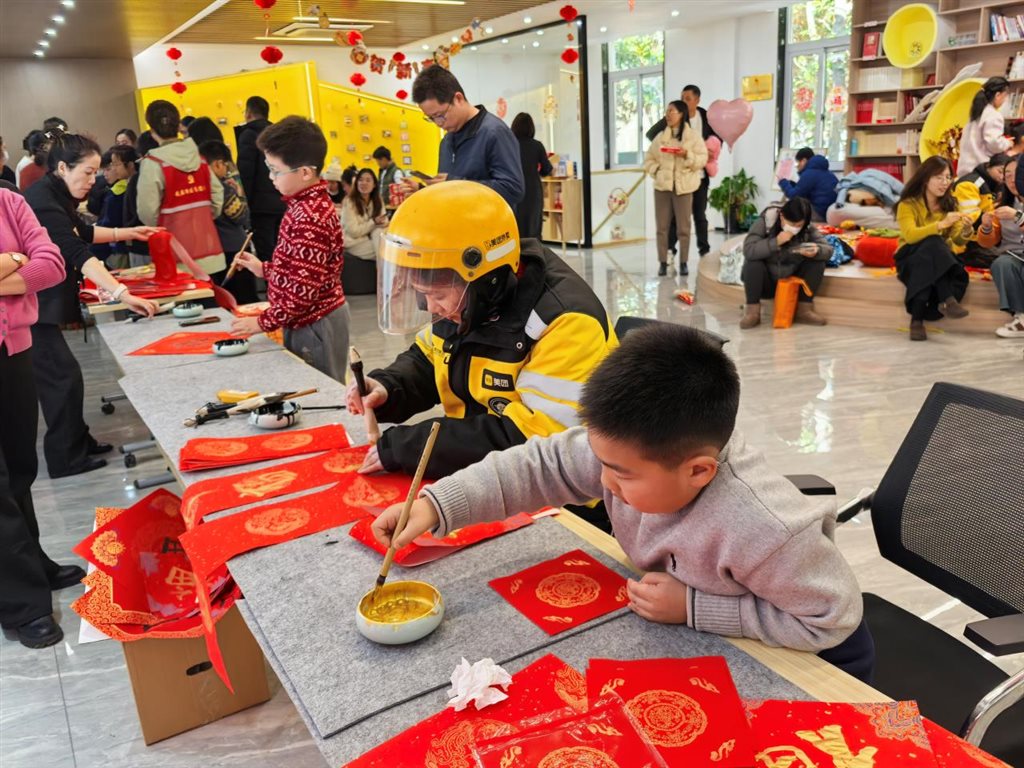 在写新春对联摊位,小朋友们纷纷拿起毛笔,全神贯注地一笔一划书写福字。现场还挂满了“春满人间 四海同庆”“春辉盈大地 正气满乾坤”等寓意吉祥美好的春联。“我平时喜欢写毛笔字,也开了一家画室,希望能发挥自己的专业优势,给小朋友搭建一个平台,为他们送上新年的祝福。”新镇街区能人徐凤莲说。