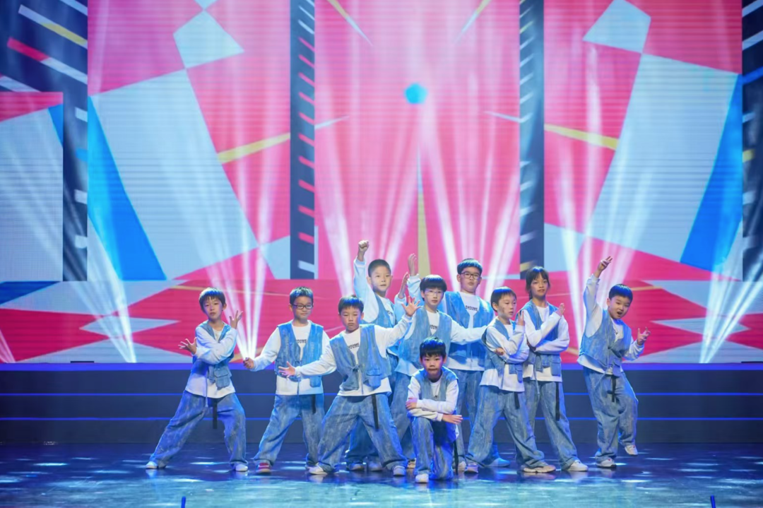一群身着白衬衣、牛仔背心和牛仔裤的孩子,一曲嘻哈风格的舞蹈《舞动童年》又嗨又可爱,赢得满堂喝彩。这是三到七年级的周末美育课堂上海市群众艺术馆街舞HipHop班学员,尽管马上就要面临期末考试,但是爸爸妈妈也积极支持他们来参加展演,送他们加排,为他们购买参演服装,积极做好团队后勤保障……