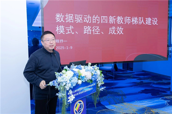 程教授在讲话中提到,在助力教师成长的进程中,要以数字化为核心驱动力开启变革,思考促进教师改变的6个关键认知条件,涵盖用数字化唤醒改变意识、拓展教学视野、搭建反思支架等。以此为基,总结出教师应具有专业力、反思力和数字力。以上戏附属浦东新世界实验小学为例,过去两年剖析三千余节课,其中得到近两千份反思报告,凸显了教育数字化让隐性数据显性,赋能教师决策与培训,驱动教师三力提升,助力学校破浪前行。