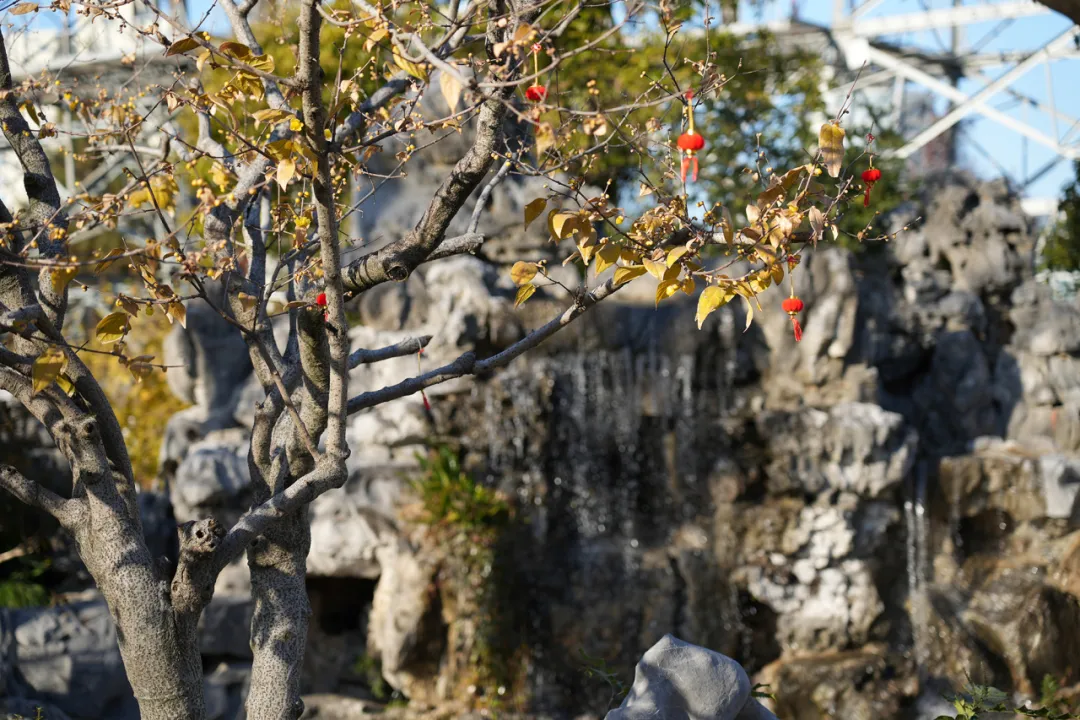 尽管这几天是申城入冬后最冷的时节,但冬日的阳光温柔地穿透云层,洒落在蜡梅古朴的枝干与绽放的花朵之上,为寒冷的季节平添了几分暖意。小巧精致的蜡梅花朵宛如镶嵌在枝头的一颗颗蜜蜡,与一旁的火红小灯笼交相辉映,闪烁着温润而柔和的光芒。不畏严寒的蜡梅竞相绽放,将淡淡的芬芳悄然释放于空气中,仿佛能带给人们一份来自大自然的希望。