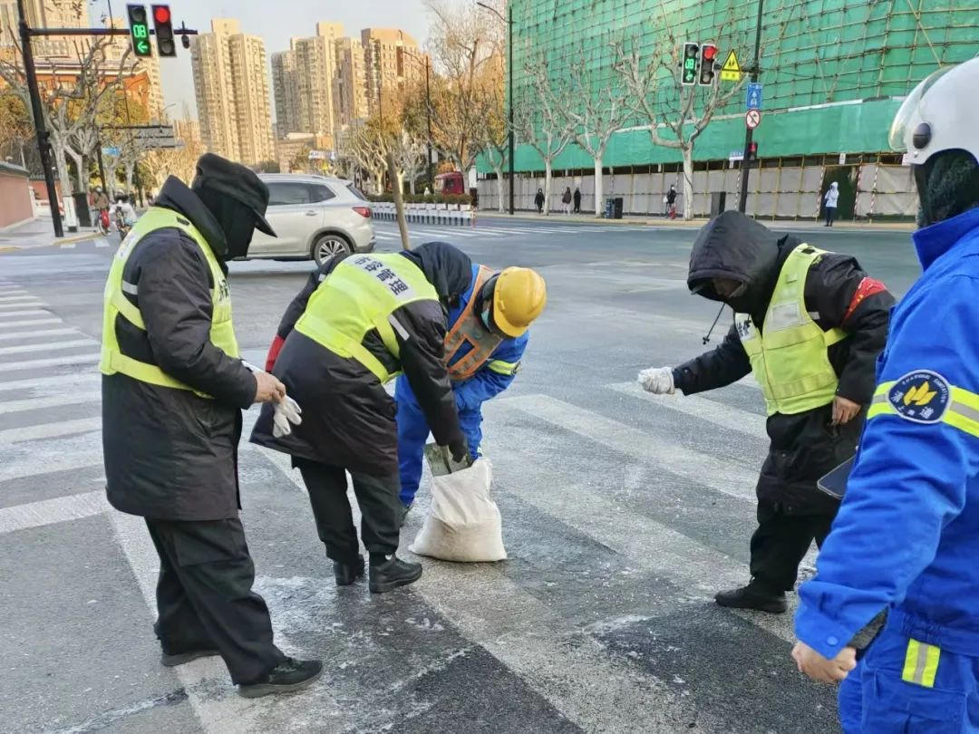 早在寒潮来临前,徐家汇街道为有效预防冷空气可能带来的积雪结冰情况,就积极组建应急抢修队伍,针对道路、住宅小区、医院、学校等重点区域制定具体的应对措施。街道联勤联动队伍协助环卫工人,在宜山北路公交站台周边、华山路与广元路交叉口等路段清理路面结冰,不断加强雨雪冰冻安全风险隐患的排查。