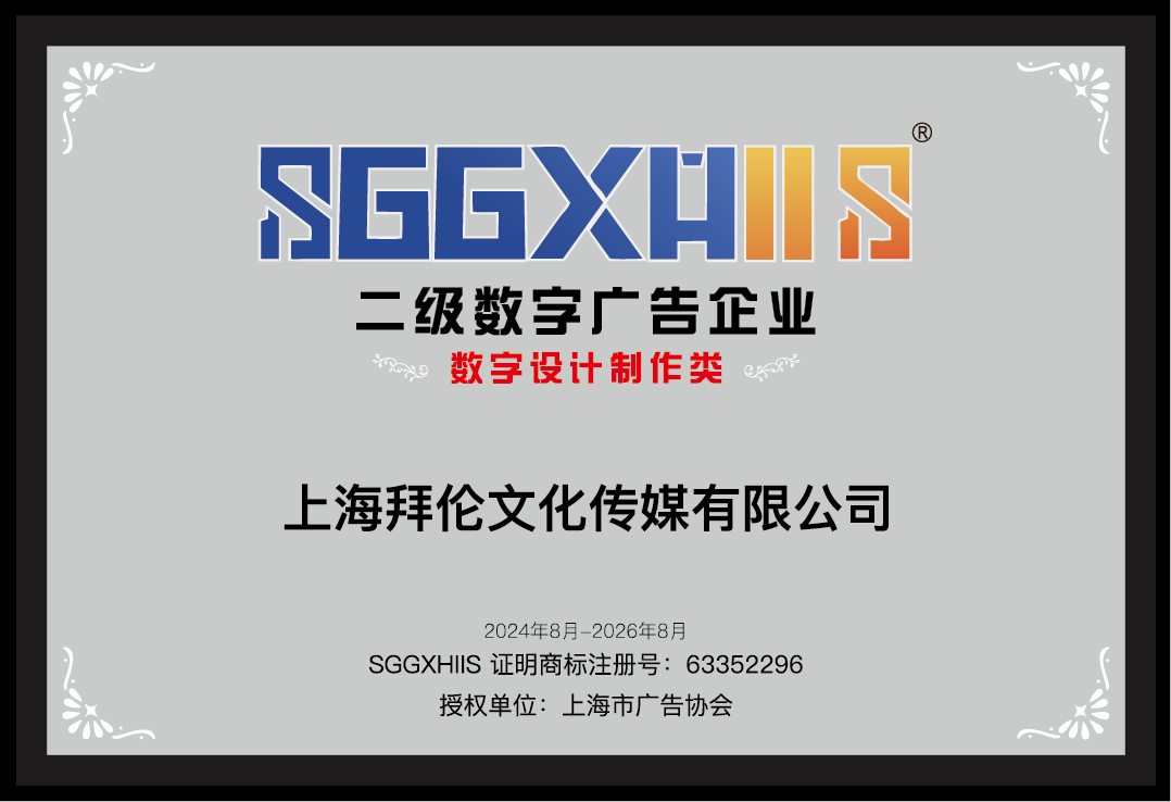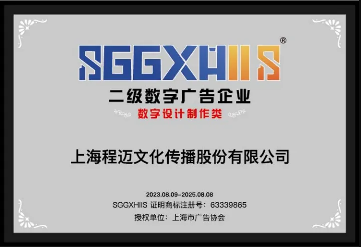 2023年8月9日,上海程迈文化传播股份有限公司被授予上海市广告协会数字广告证明商标“SGGXHⅡS二级数字广告企业(数字设计制作类)”。