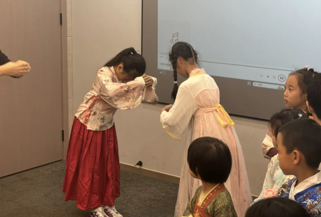 穿上汉服,亲身体验一把当古人的感觉怎么样?在天龙党群服务中心·邻里汇,小朋友们参与了一场新雅乐吟唱活动。在老师的悉心指导下,小朋友们通过反复练习和体会,掌握了诗歌《子衿》的旋律和节奏,感受诗歌中蕴含的深厚情感。随后,老师带领小朋友们学习了古人的行礼方式,大家身着华丽的汉服,举手投足间尽显优雅,不仅动作标准,还十分投入,对传统文化的尊重和热爱之情溢于言表。