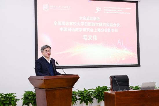 大会闭幕式由上海大学日语系主任赵莹波主持。中国日语教学研究会上海分会副会长毛文伟在总结致辞中指出,外语学科在新时代背景下肩负重要使命,人工智能对学科发展起到支撑作用,为新时期的人才培养机制提供了新的可能。