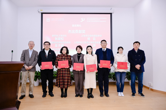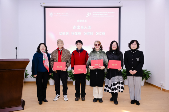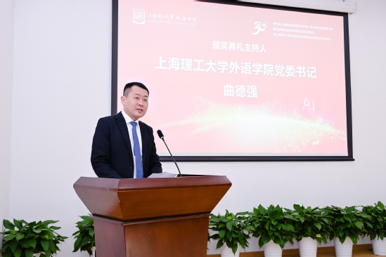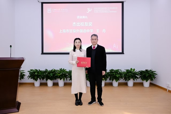 外语学院党委书记曲德强主持日语专业成立三十周年颁奖仪式。他指出,风雨兼程三十载,春华秋实育英才。日语系的发展源于社会各界的大力支持。上海市教育委员会国际交流处原副处长张进、上海市人民对外友好协会日本处原处长张雪娜为上海市甘泉外国语中学校长杨云、包玉刚实验学校原总校长吴子健、上海市松江区青少年综合实践教育中心副主任王妍、新华社高级记者张建松、上海日本研究交流中心负责人姜咪红、上海市日本学会副会长马利中颁发“杰出贡献奖”。上海市教育工会干部吴波、外语学院副院长韩戈玲为日语系荣休教师张继彤、张莲群、张文碧、徐彭阳颁发“杰出育才奖”。外语学院党委副书记金小东为外语学院日语系第一届本科生、上海市甘泉外国语中学副校长王丹颁发“杰出校友奖”。