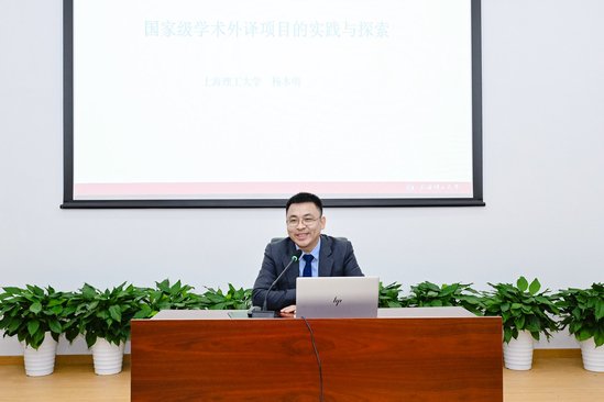 外语学院日语系主任杨本明以《国家级学术外译项目的实践与探索》为题,从宏观角度对国家外译项目进行了深入细致的介绍,建议外语人才积极响应国家号召,传播中国声音,阐释中国特色,精准传达中华文化精华,译好不断行进变化的中国,促进中外文明交流互鉴。