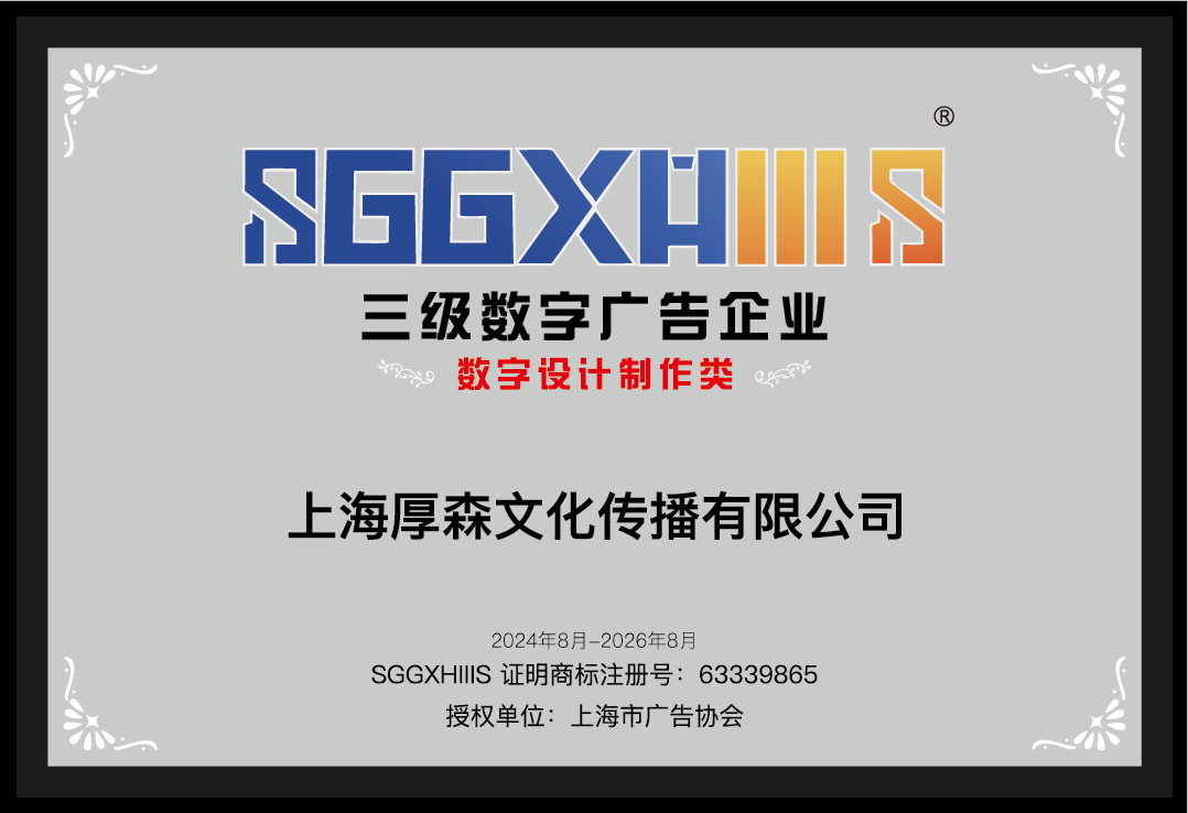 IDA很荣幸获得“SGGXHIIS数字设计制作类”证明商标这一殊荣,不仅是对我们过往辛勤付出的认可,更是对我们未来的看好与激励。我们将致力于发挥这一荣誉的价值,继续创作出更多优质的作品,树立更高的团队要求,在行业内扩大知名度和影响力,起到积极的示范作用和榜样引领者,为数字广告行业贡献出我们的力量。