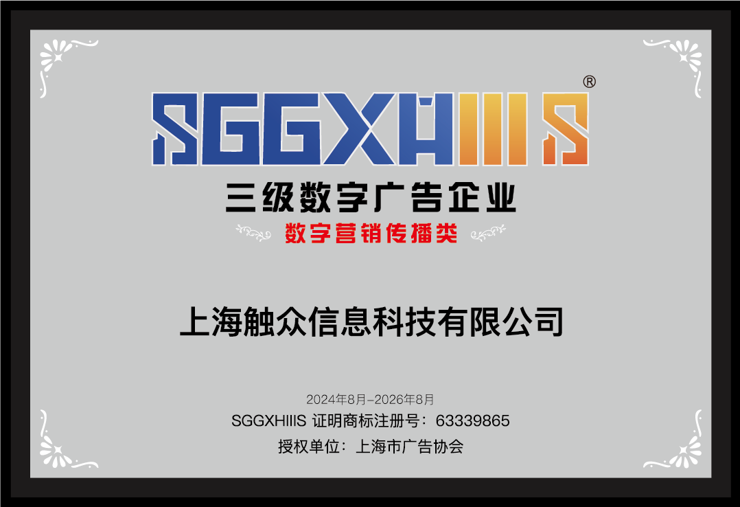 上海市广告协会数字广告证明商标(“SGGXHⅠS”“SGGXHⅡS”“SGGXHⅢS”)是经国家知识产权局核准注册的,用于证明特定广告企业数字化转型能力的证明商标,含有数字内容的证明商标具有行业唯一性。它是上海建设数字广告之都的重要抓手,是奠定未来上海在中国广告业乃至全球广告业中地位的重要内容,它的授权使用能充分提高企业自身能级建设,助推企业向行业头部看齐,是上海市广告业数字化转型的先行先试排头兵。它的授权使用具有重要意义:一是行业优质企业身份的认定;二是数字广告标准体系实施的服务保障;三是为行业发展树立标杆榜样;四是为深化扶持政策落实加持,实现广告企业效能的增长;五是有利于提升广告企业的自身品牌价值;六是为促进行业高质量发展发挥重要作用。同时,数字广告证明商标在今年申请中小企业专精特新认定时享受到政策加持,今后将进一步为数字广告证明商标在政策上赋能,推动数字广告证明商标在企业招投标等事项中起到重要的作用,产生品牌效应。上海触众信息科技有限公司