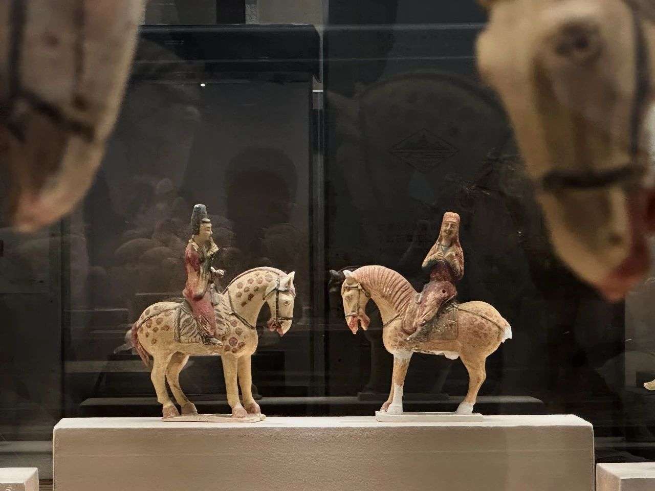 三彩女骑马俑,出土于李贞墓。女俑头戴饰有连枝梅花图案的翻檐胡帽,俑身为朱、黄、绿三彩相融。女俑眉清目秀,身材窈窕,着胡装,秀美之中平添了几分男子的潇洒与英挺,别有一番风韵,体现了强烈的时代感。雕塑家通过对大唐皇家贵妇形象的塑造,呈现了胡风盛行的社会风貌。