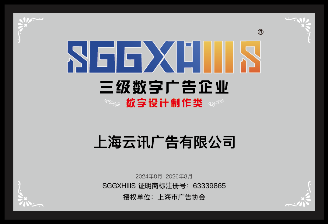 2024年8月荣获《上海市广告协会数字广告证明商标》,此证不仅增强了我公司的信誉和公信力,还有助提升我司在市场的竞争力。这种信任给我们赢得了更多的业务机会,特别是对于大型项目或长期合作项目,客户更愿意与有资质、信誉良好的企业合作。
