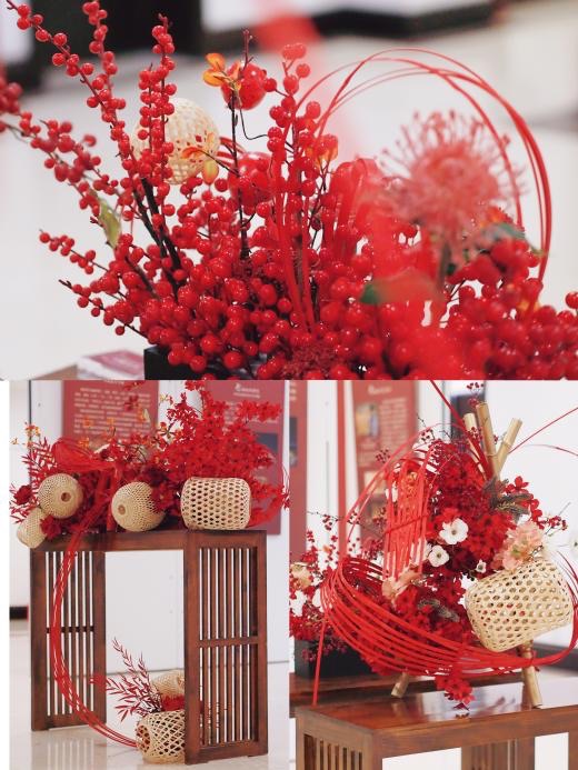 展厅中央是一组以“春节”为主题的作品。红色的竹篾从桌面跃起,再以弯曲的形态垂落到地面,仿佛一条舞动的灵蛇,作品《蛇舞新春》将节日的喜庆氛围烘托得恰到好处。《花开烂漫》和《硕果盈枝》将竹艺搭配以冬青、针垫花等年宵花束,寄托着对来年繁花似锦、硕果累累的美好祝愿。