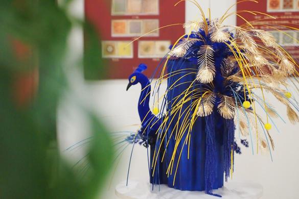 主视觉展区内,盛开的花朵从竹编的小船中“倾泻”而下,优美的形态赋予了静态的作品以动态的联想,《泛舟花海》装置作品与春节游船视觉插画相互映衬,共同构成了张灯结彩的节日场景。设计师以杨浦图书馆“孔雀门”为灵感创作的《雀栖竹影》,通过凤尾叶等花材与竹艺的结合,展现了一只亭亭玉立的孔雀在摇曳竹影中栖息的场景。