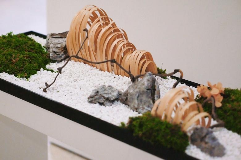 立春将至,春意已来。展厅尾部两件以“春天”为主题的作品充满了绿色的生机。《锦绣山河》以白砂为底,绿藓为林,由竹篾塑形而成的山峰,高低错落,呈现出山峦起伏的写意。而与之呼应的另一件作品则在枯山水间生长出暖意的山花,正是一幅“春色满园关不住”的画面。