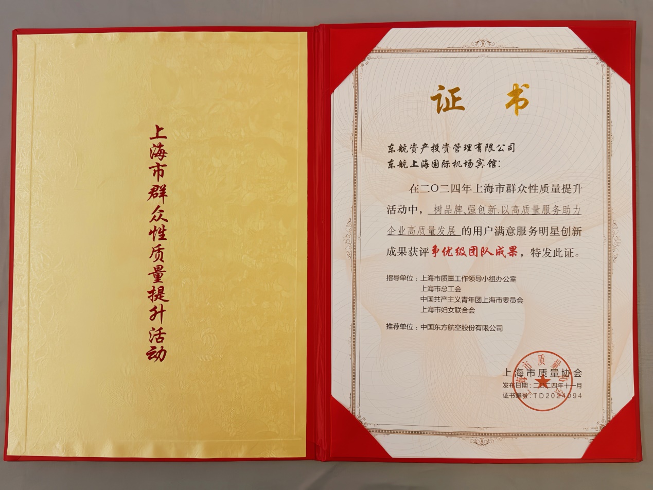 喜报!机场宾馆荣获2024年​ 上海市“用户满意服务明星团队”争优级团队成果