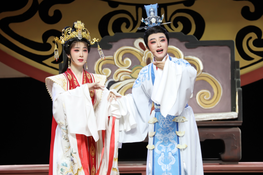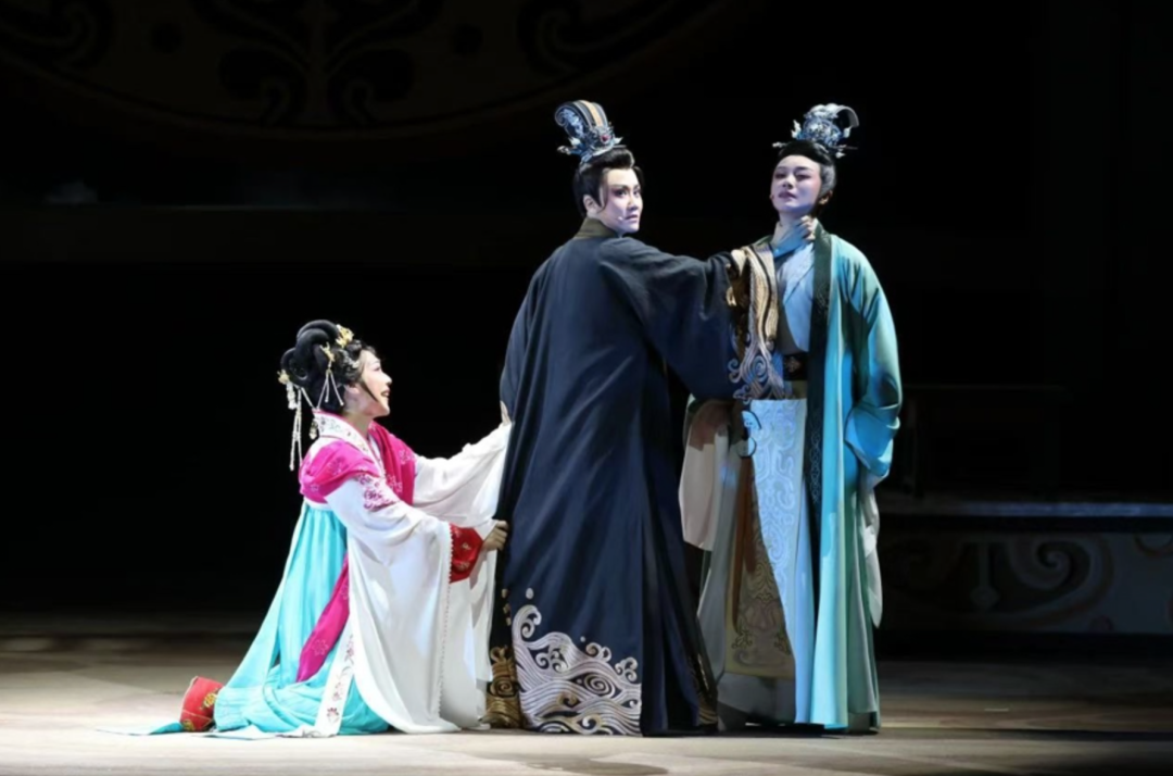 在保留越剧传统唱腔和表演风格的基础上,《重圆记》唱腔设计金良融合多种越剧流派唱腔,充分展现了越剧艺术的丰富性。王清在剧中饰演杨素,她将“尹派”唱腔的深沉与儒雅融入角色,展现出人物复杂的内心世界。舞美设计胡佐为《重圆记》构建的舞台空间围绕“重圆”二字,从“圆”展开、以“圆”结尾,展现“破镜终将重圆”的美好愿景。行走在“圆”中的人,秉承魏晋之风,服装浓烈的色彩搭配和细腻的花纹图案,也提升了作品整体氛围感,把越剧的浪漫婉约展现得淋漓尽致。