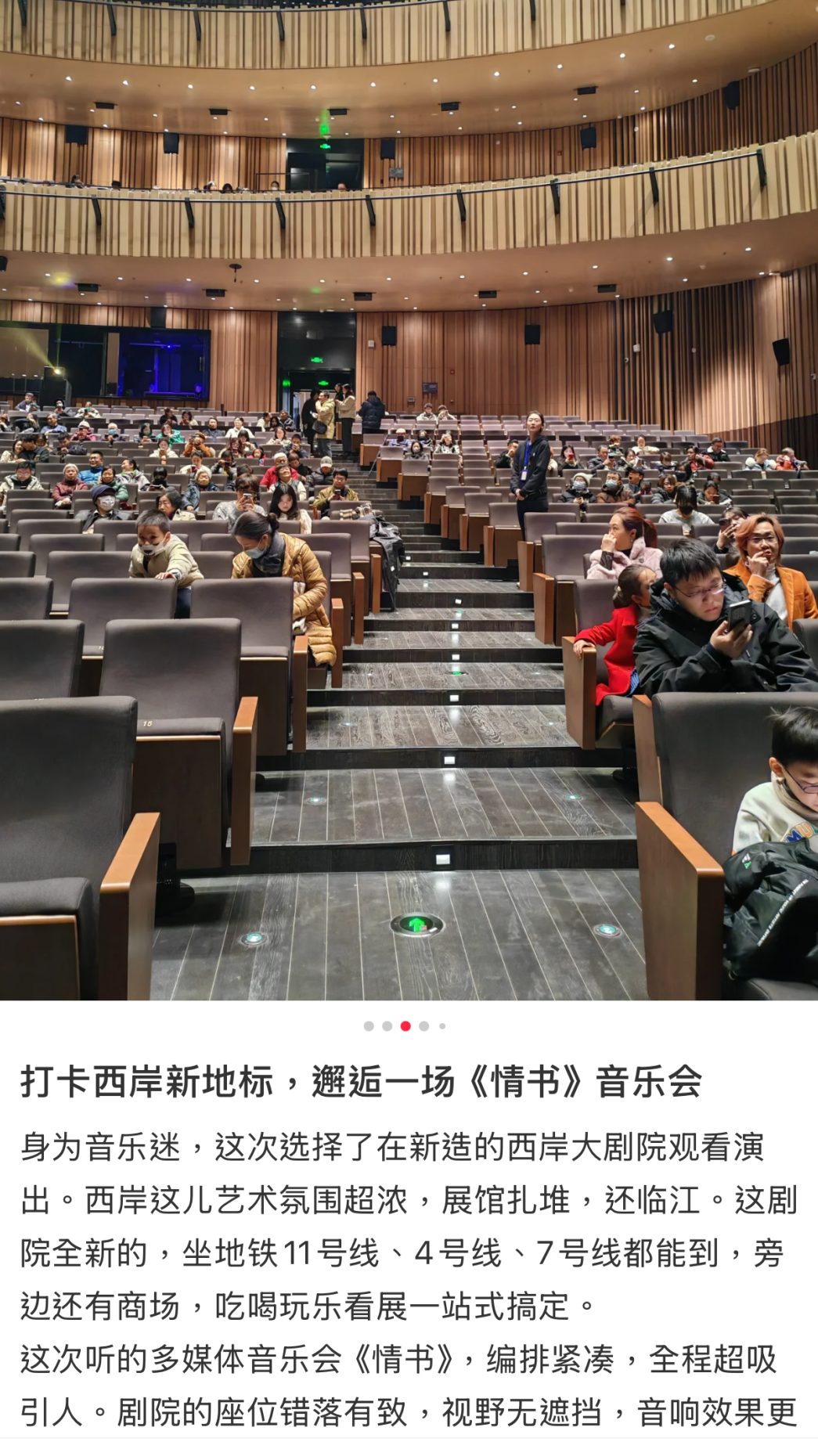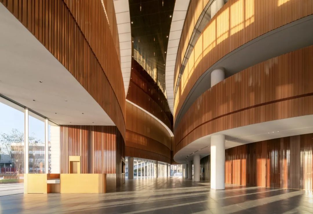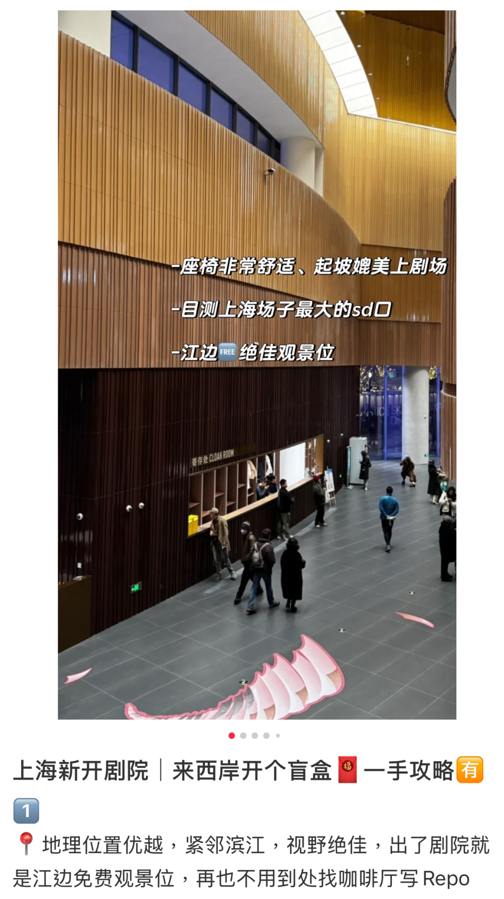 大面积通透的玻璃、滨江栈道同款大地色系的内部装饰和顶部金属光泽的吊顶,让这里不仅是一个为看剧而存在的艺术场馆,更将成为人们在西岸生活、休闲、娱乐的社交目的地。