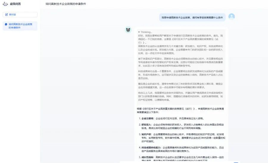 依托DeepSeek的深度思考与智能匹配能力,为企业提供精准化、定制化的政策服务,解决企业查找政策的烦恼,打破惠企政策与企业需求之间的壁垒,真正实现惠企工作由“企业找”到“主动送”的转变,让政策红利精准触达每一家闵行企业。
