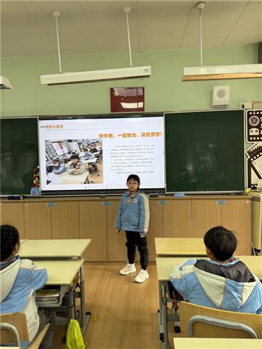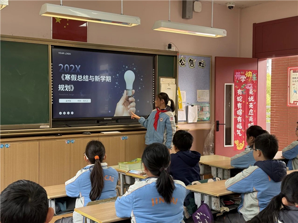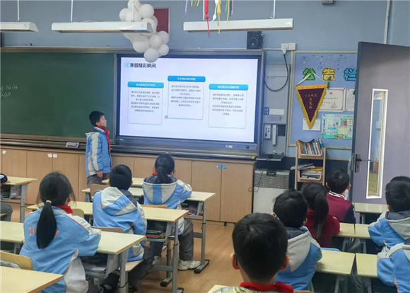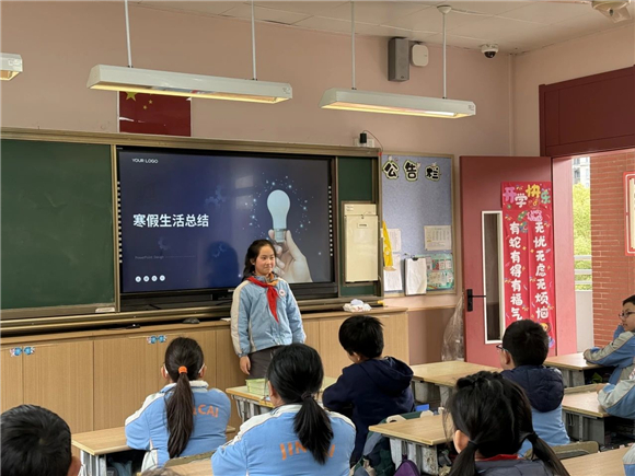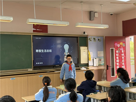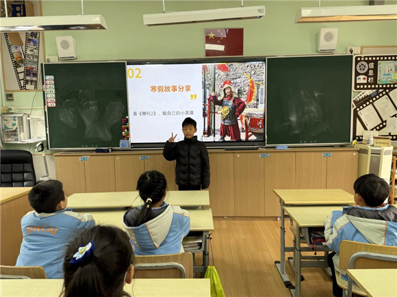 老师让小朋友们分享了寒假生活。鲁果表演了一段非常精彩的rap,分享了他在寒假中最开心的一件事情,观看了电影《哪吒2》,通过观看这部电影,教会我们要做自己的英雄,以后我一定也会变得更加勇敢,在面对困难的不退缩。