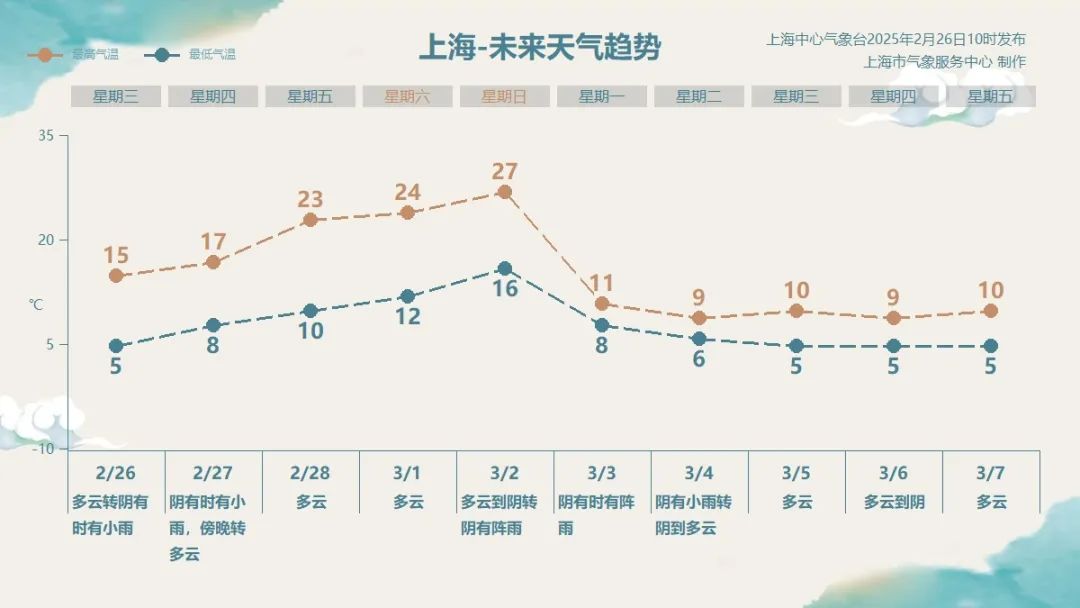 明天白天,上海将维持阴有时有小雨的天气,傍晚雨止转多云,气温继续回升,全天在8~17℃之间,风小湿度大。周四夜里到周六早晨,上海及沿岸海区将出现能见度小于500米的大雾天气。周五到周日,受暖气团影响,上海温暖如春,特别是周日的最高气温冲上27℃。