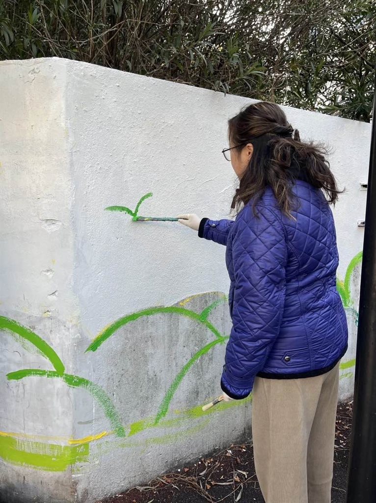 随着社区环境的不断提升,居住在共和九村的居民们对文明养犬的呼声日益高涨。为营造良好的小区环境,共和九村居委会在听取居民的意见后,决定利用小区中心广场旁的墙壁作为“文明养犬”的宣传载体,围绕“文明养犬,健康生活”主题进行彩绘美化,并协调联动社会资源,邀请专业绘画老师和社区居民、志愿者,共同参与彩绘墙设计与绘制。