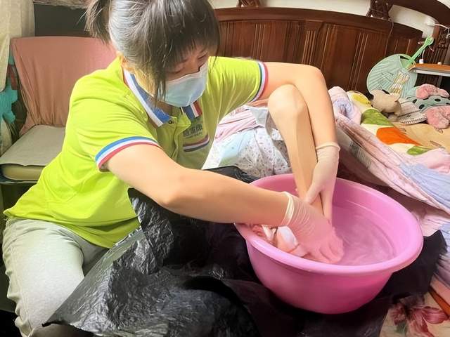 她每天的主要工作就是不厌其烦地为不同社区不同长者进行床上擦浴、手足清洁、协助进食、口腔清洁、排泄护理等,每天服务的人数多则7-8个,少则5-6个。