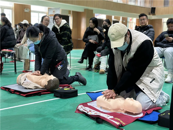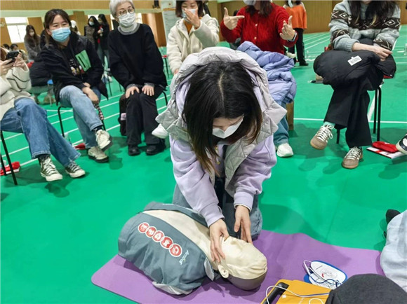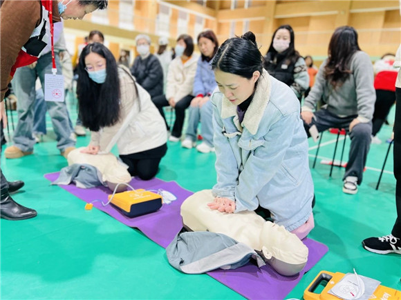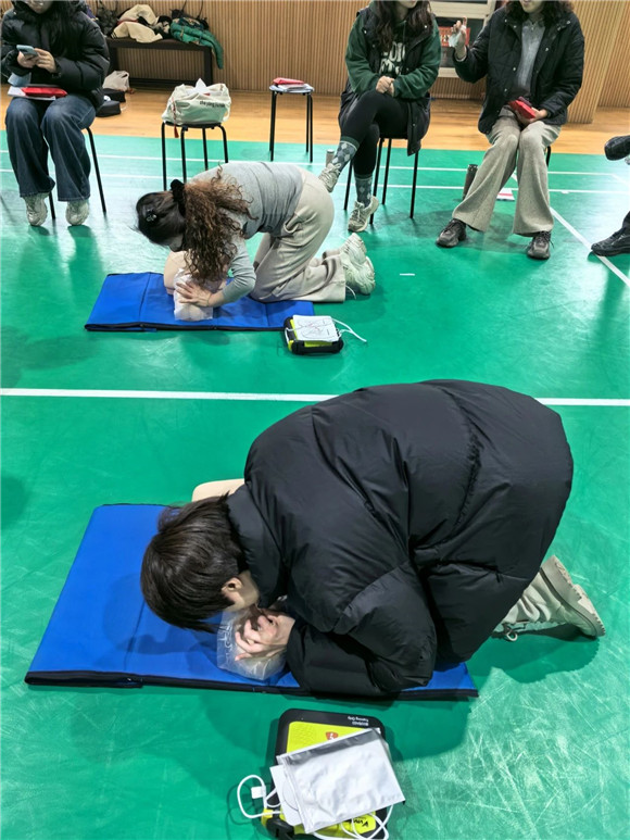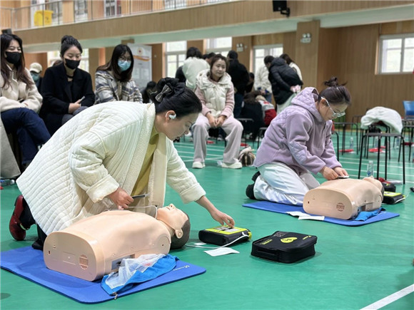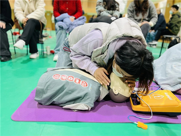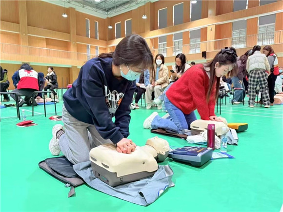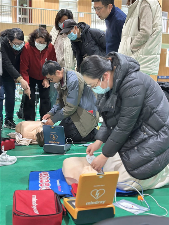 心肺复苏是生命救援的关键技能。培训团队强调心脏骤停的抢救关键在于"黄金4分钟",高质量的心肺复苏和快速使用自动体外除颤仪(AED)是抢救心脏骤停患者最有效的方法。掌握这些技能,可以为患者争取宝贵的生存机会。老师们认真观看教学视频和讲师的示范,在培训团队一对一的指导下,大家学习了心肺复苏的基本操作步骤,包括判断环境安全、检查伤者意识、判断呼吸、拨打急救电话、包括按压位置的精准定位、按压频率与幅度、人工呼吸前的口鼻腔清理以及开放气道的方法。同时,大家还亲自操作了AED设备,熟悉了其使用方法。通过实操练习,老师们对心肺复苏和AED的使用有了更加深入的了解,增强了应对突发心脏骤停事件的信心。目前,学校两个校区均已在卫生室配备安装了AED,为校园安全提供了有力保障。
