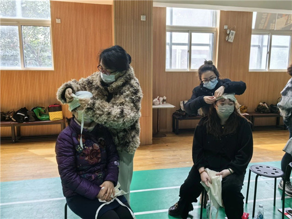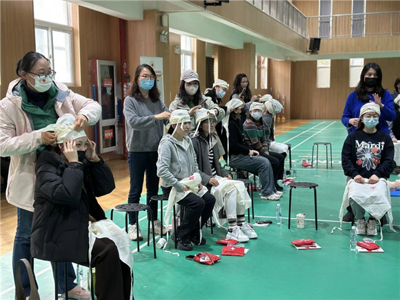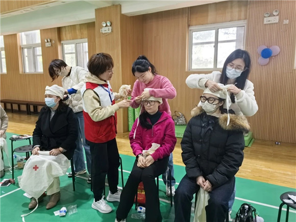 创伤包扎在校园内最为常见且实用,主要用于处理学生的小伤小痛,比如割伤、擦伤、扭伤等。培训团队针对不同创伤情况,详细演示了如何利用绷带、三角巾等日常物品进行有效包扎。讲解之后,老师们两两一组认真反复地练习,利用三角巾和绷带,对头部、手臂、大腿等常见受伤部位进行了包扎。这些技能对于处理校园中的意外伤害非常重要,能够有效地减轻伤者的痛苦,防止伤情恶化。