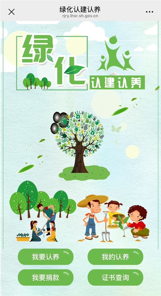 据上海市绿化市容局介绍,上海正推行“通过互联网+全民义务植树”。市民可通过随申办APP、微信公众号“绿色上海”、全民义务植树网等途径进入认养捐赠平台,实现在线认养树木或捐资。认养全流程在线,所有能提供认养树木的信息及动态均在平台上公布,让认养更透明、更便捷。同时,线上平台提供更人性化的后期服务,市民可以通过手机,在自己的认养记录中,查看认养信息、尽责证书、及认养树木(群)的照片或视频(部分为实时视频),让市民能更多地关心、享受绿化成果。