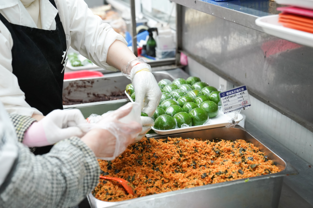 市民们为何钟情这款青团?记者在后厨看到,师傅们手脚麻利地赶制包馅。原来,她们从凌晨三点半开始打糯米粉,经过90到100分钟的蒸煮,让青团皮更加软糯。而蛋黄肉松馅则是经过翻炒,即便包裹上青团皮,也能保证里面口感是脆脆的。