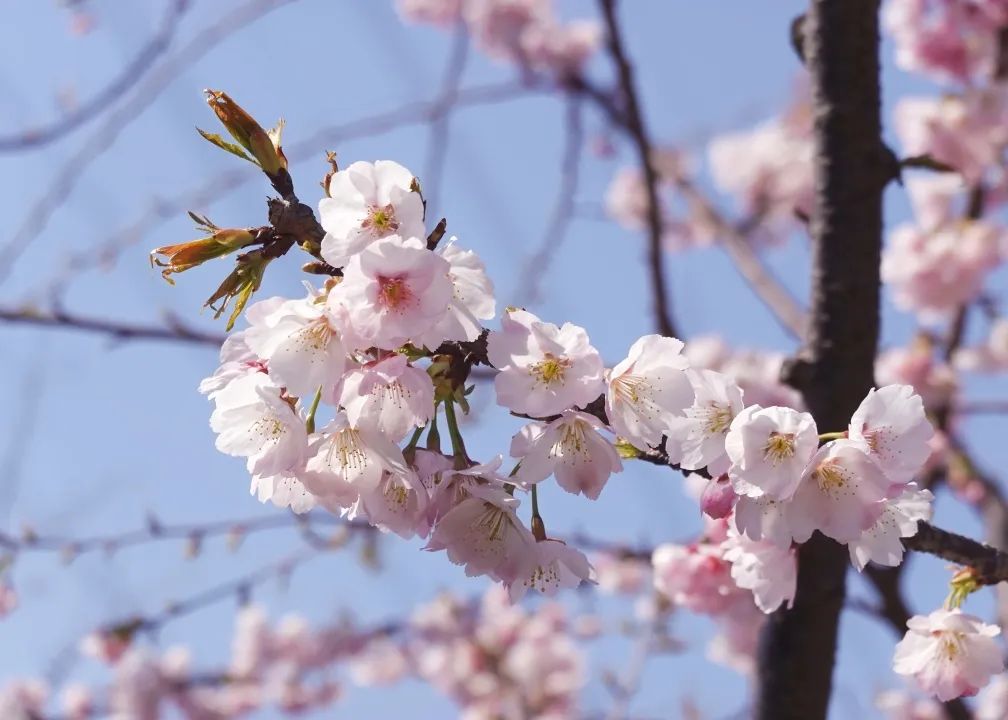 落叶乔木,是大岛樱和钟花樱的杂交品种。花期2月下旬至3月上旬,花粉红色,先花后叶,是十分美丽的樱花品种。