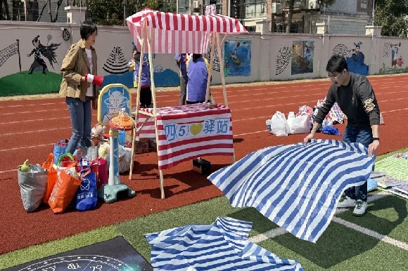 中午时分,操场上的“创意工坊”就在学生和家长志愿者的巧思妙想中准备营业了——“宝贝当家摆个摊”“爱在义起”“爱心小集市”……展台名称脑洞大开,宣传标语更是妙趣横生。班主任带领同学们清点义卖品、布置展台,一张张课桌变身“宝藏市集”,承载着大家沉甸甸的善意。