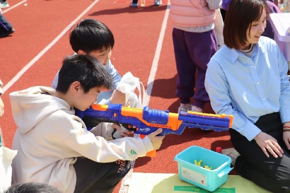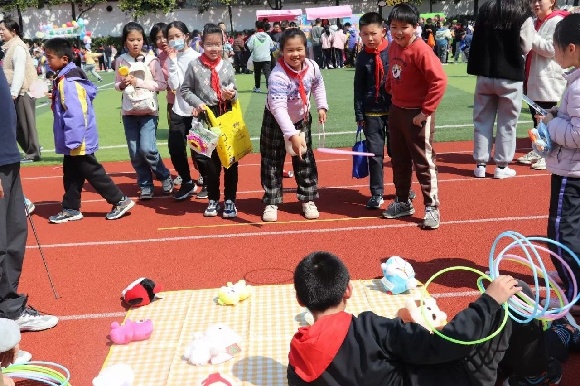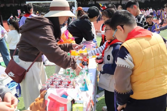 你瞧!书香驿站里,七成新的书籍被小手捧走;手作工坊中,饰品彩绘引来阵阵惊叹;零食小铺中,美食饮料令人馋涎欲滴;趣味竞技场旁,套圈、投掷沙包等游戏正传递着运动的快乐。