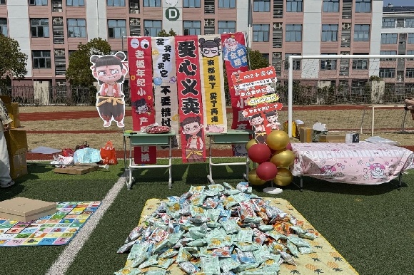 操场如同一个“爱心大超市”,各个班级的爱心摊位前人头攒动,迎来了一批又一批“公益小精灵”。