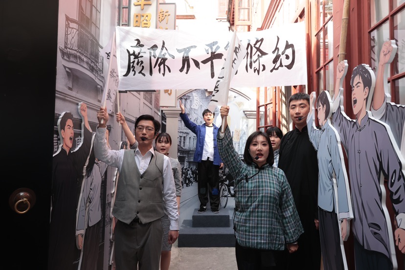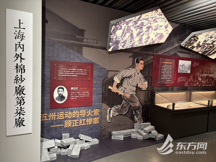 在现场记者看到,展区专门开辟出一面墙讲述五卅运动的导火索—顾正红惨案。不仅如此,沉浸式党课《工农联盟坚、五卅怒潮翻》的故事,也是从顾正红讲起。