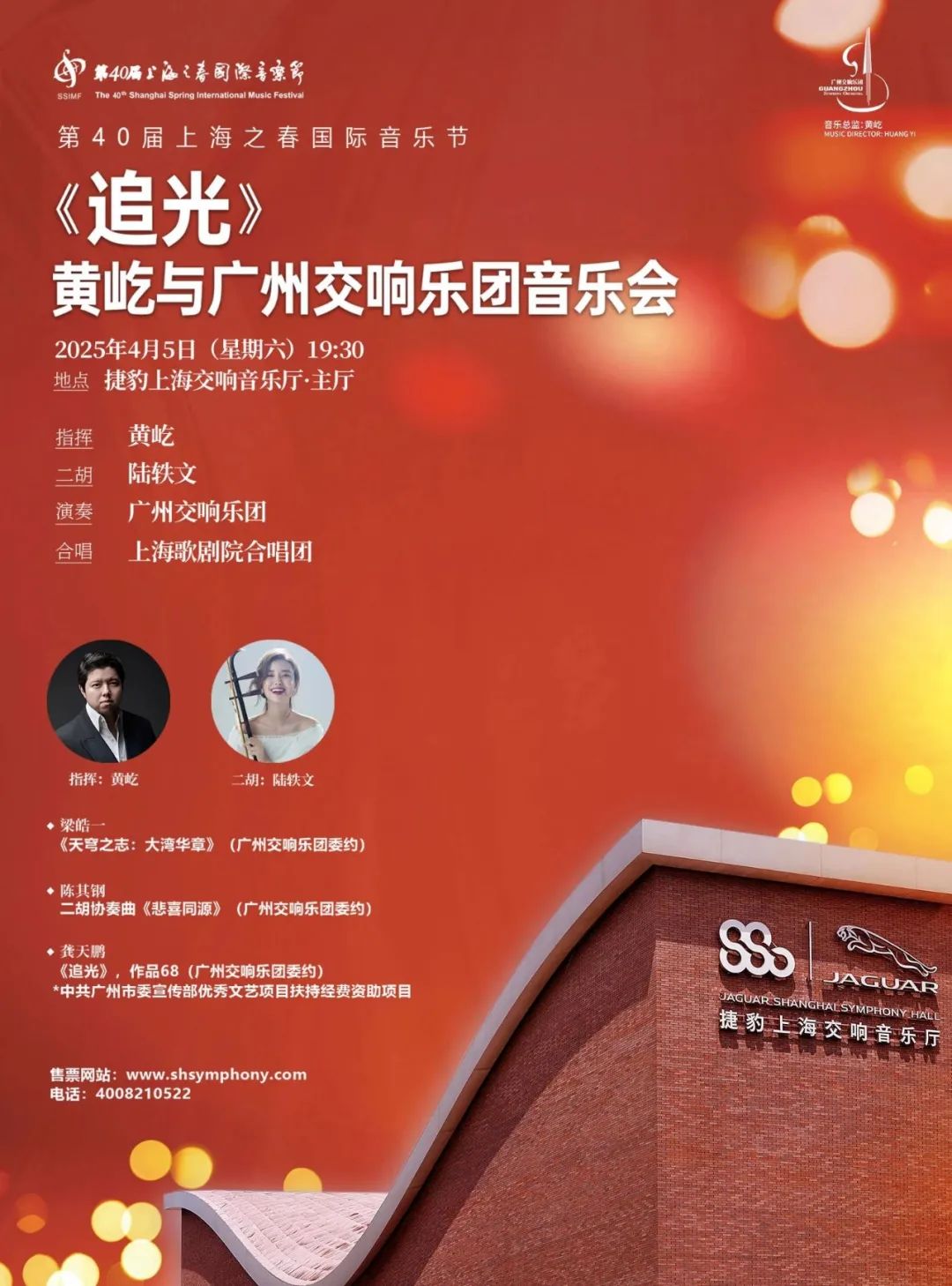 4月5日,广州交响乐团将在音乐总监黄屹的执棒下,在捷豹上海交响音乐厅举办的第40届上海之春国际音乐节专场音乐会,与上海歌剧院合唱团合作,奏响由广交委约青年作曲家龚天鹏以《国际歌》为灵感与素材创作的交响曲《追光》。