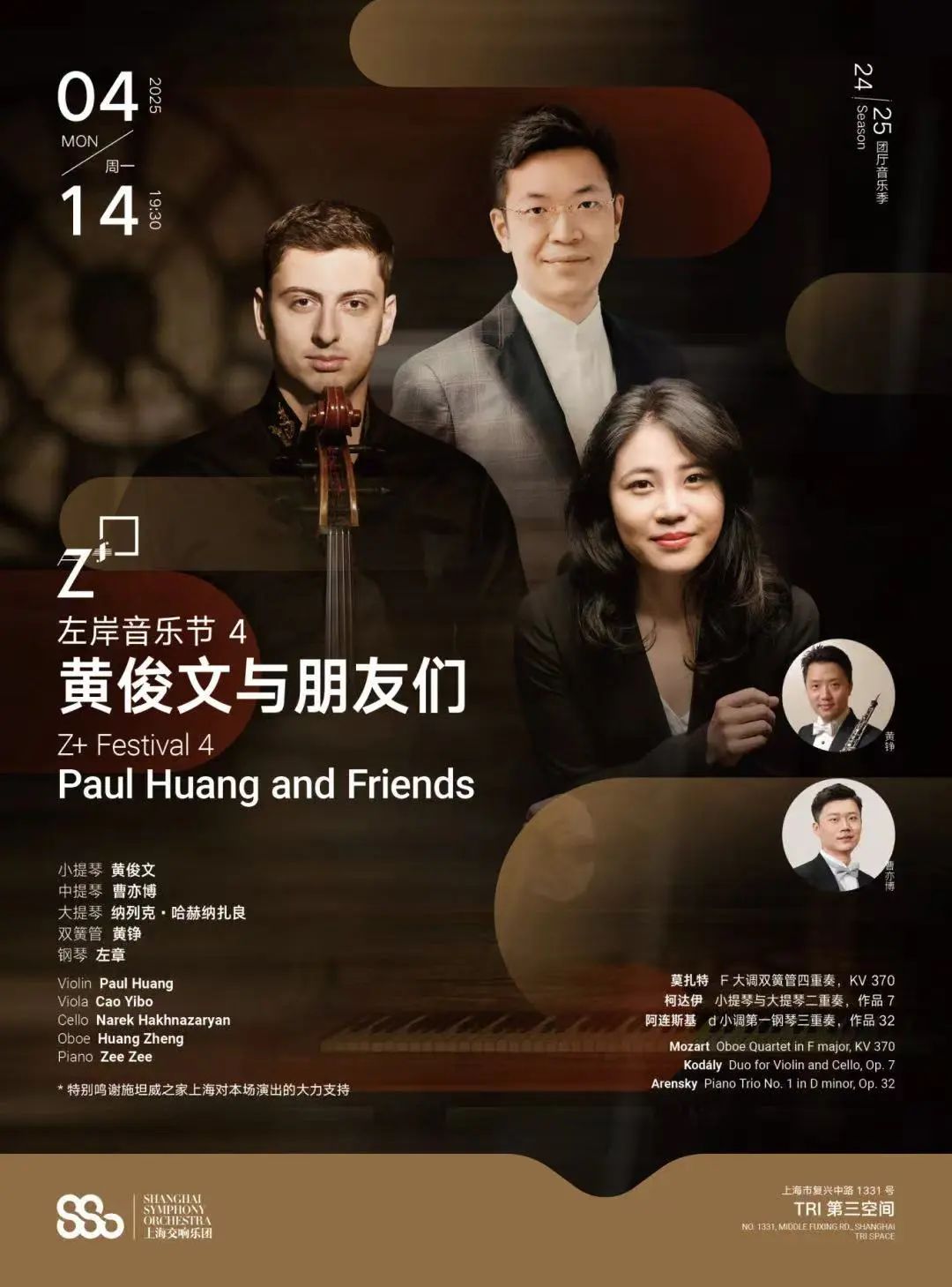 黄俊文携手大提琴家纳列克·哈赫纳扎良、钢琴家左章、双簧管演奏家黄铮和中提琴演奏家曹亦博,演绎莫扎特、柯达伊和阿连斯基的经典室内乐作品。