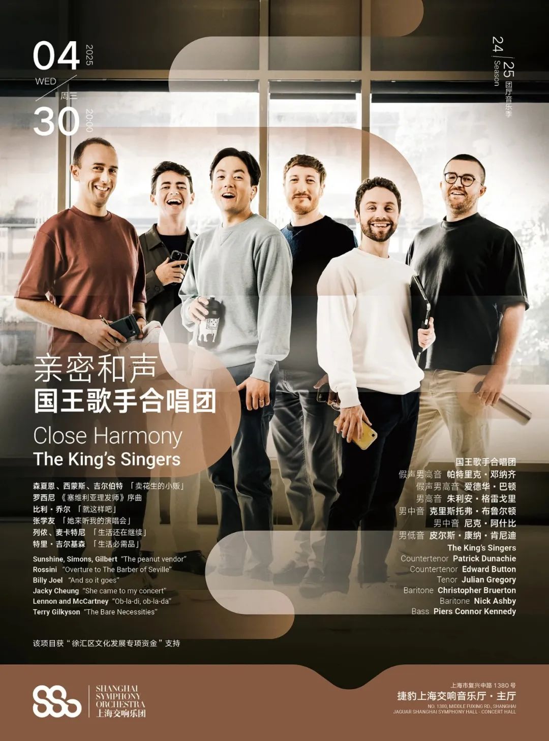 演出标题“Close Harmony”(密集和声)来自他们2024年10月刚刚发行的同名新专辑,同时也是这支组合标志性的作曲和改编风格。在成立初年,由于没有足够多适合男声六重唱的古典曲目撑满一整场音乐会,他们不得不着手改编各种风格流派的流行名作一一流行、摇滚、爵士、喜剧、民歌、影视原声、迪士尼动画等等。自此,严肃和轻松曲目的意外组合让观众欣喜若狂,并迅速成为国王歌手的名片。