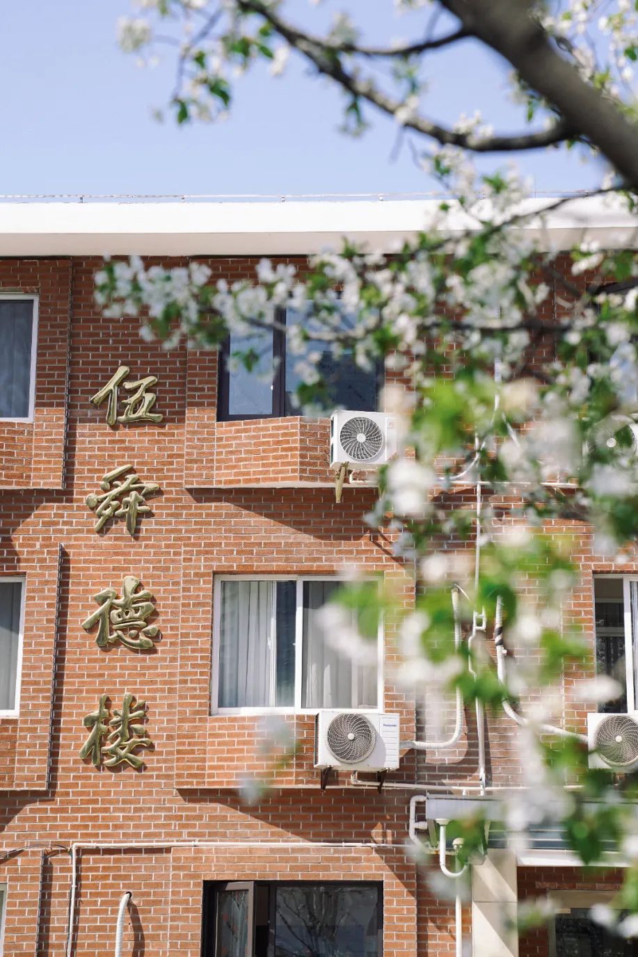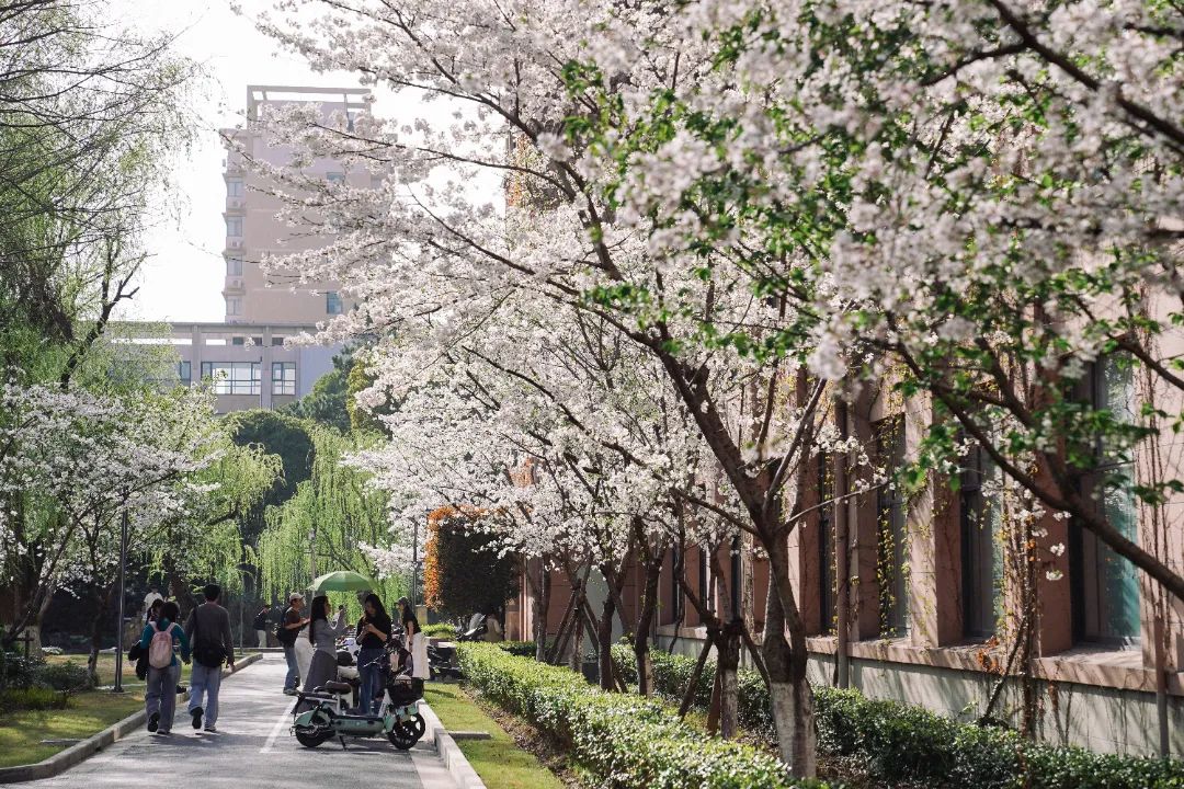 在徐汇腹地,上海交通大学徐汇校区的红砖建筑群掩映在长出嫩叶的樱花树间,更添别样春意。伍舜德楼前、百年校庆里程碑旁……一簇簇或雪白或樱粉的花瓣为这座百年校园注入了春日的别样美丽。这里的春天,是历史与现代的交织,沉稳中透着蓬勃的生机。