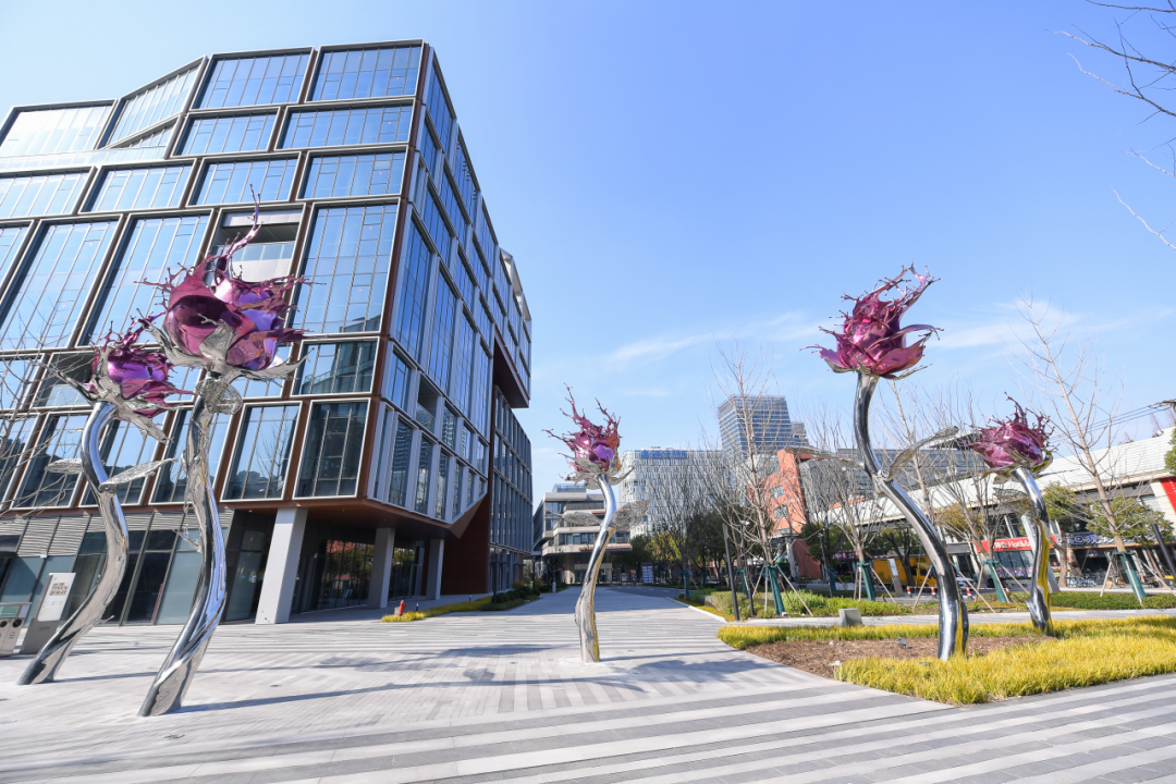 越界锦和尚城广场上,艺术家郑路的作品《绽放的淋漓》由五朵硕大的玫瑰花装置构成,玫瑰花仿佛在风中摇曳,绚烂的色彩和生动的形态,展现了生命的活力与美好。