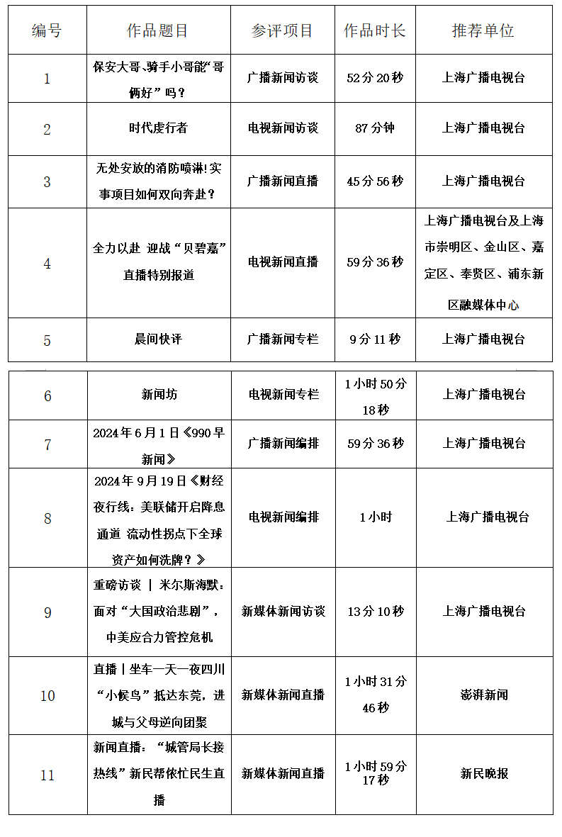 经新闻单位推荐、评选会评议表决,下列11件作品拟报送参加第三十五届中国新闻奖音视频新闻访谈、音视频新闻直播、广播电视新闻编排、广播电视新闻专栏初评,现予以公示,至4月15日止。如有意见,可向上海新闻奖评奖办公室反映。