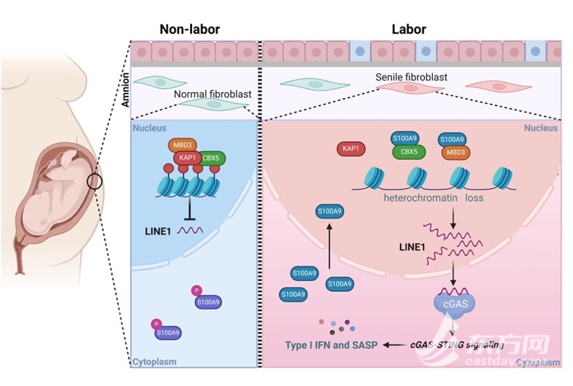 研究团队发现,在分娩过程中,一种名为S100A9的蛋白质发生了"身份转变"——它去磷酸化后从细胞浆"搬进"细胞核内,并通过与特定蛋白合作,开放了细胞核内异染色质的"基因锁"。这种变化导致原本被严格管控的转座子元件(LINE-1)大量表达,从而通过I型干扰素反应启动细胞的衰老机制,促使胎膜细胞进入衰老状态并释放炎症信号,最终推动分娩进程。