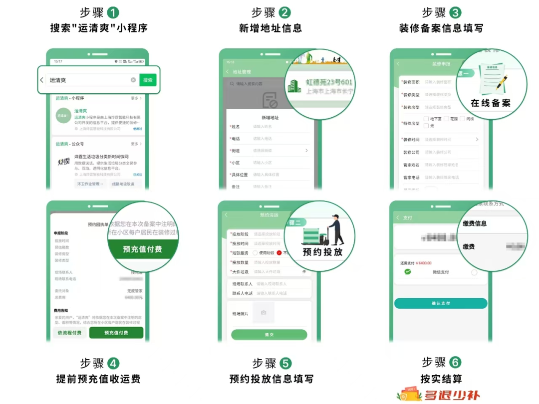 居民通过“运清爽”小程序即可在线发起清运申请,系统将基于房屋面积、装修类型等参数,智能评估垃圾总量并推荐适配箱体数量后,小程序实时显示政府指导价,杜绝乱收费。居民在手机端可实时查看费用明细、追踪清运车辆位置,实现从预约到结算的全流程透明化管理。清运企业则依托数字化调度平台,在约定时段前将可移动组合箱放置至堆放地。