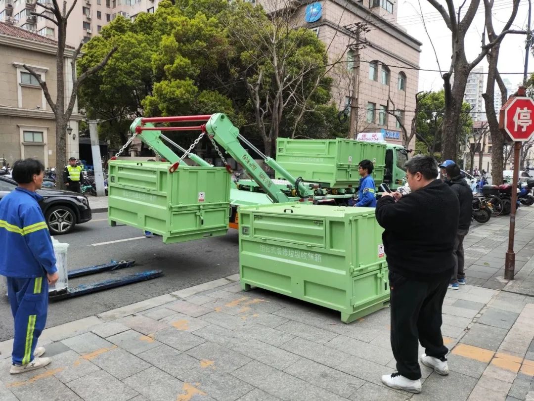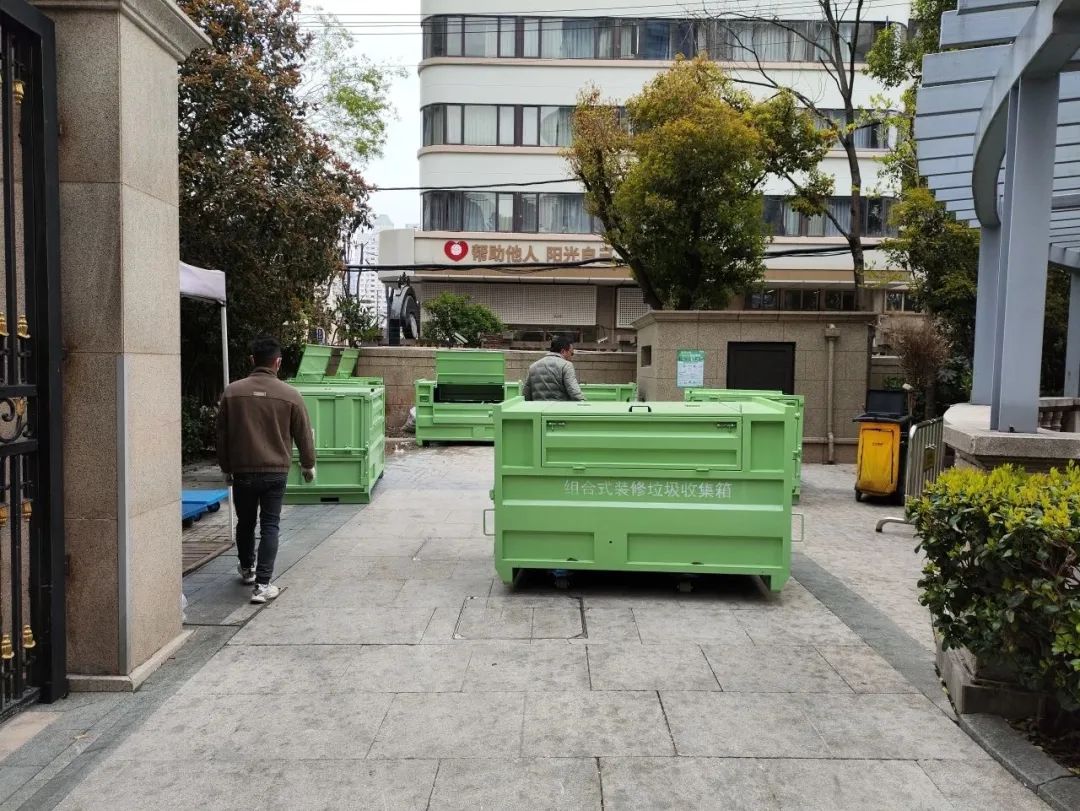 组合箱采用全封闭式设计,装修施工人员将装修垃圾搬运下楼装箱,利用叉车实现15分钟完成组合箱更换。清运时,环卫公司会整箱拖走,全程装修垃圾不落地,避免了噪音、二次扬尘扰民的情况,提升了装修垃圾的清运效能。