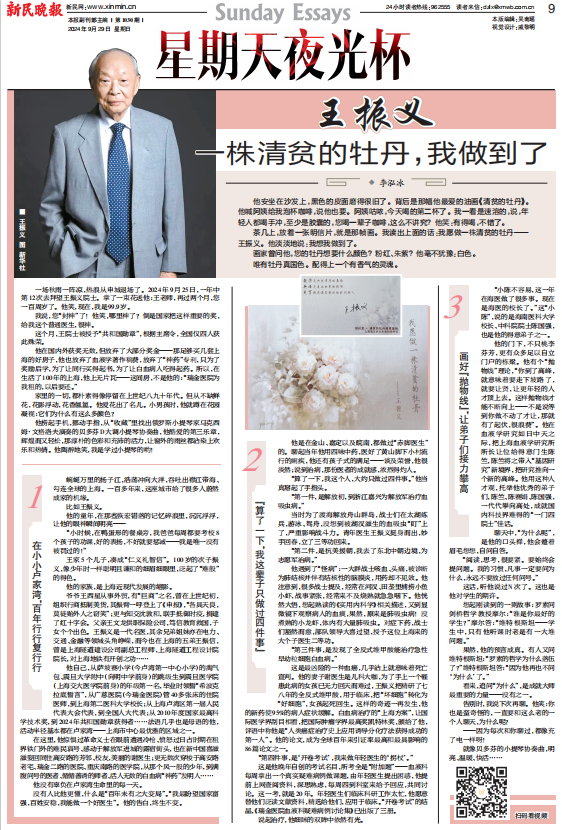 一场秋雨一阵凉,热浪从申城退场了。2024 年9 月25 日,一年中第12 次去拜望王振义院士。拿了一束花送他:王老师,再过两个月,您一百周岁了。他笑,现在,我是99.9