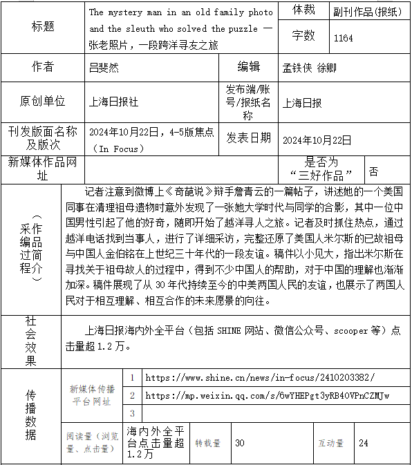 在1949年的《上海扶轮社成员名册》中,米尔斯找到一张Gin Bo-min的照片以及他的汉语名字,但是图片非常模糊。最终,凭借中国朋友的帮助和AI图像识别技术,他锁定了"金伯铭"三个字。