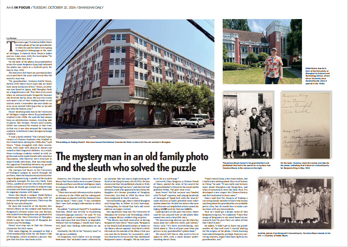 He then did research at the Bentley Historical Library on the campus and found out Benjamin's Chinese name was Gin Bo-min, who hailed from Hangzhou and graduated in 1930 from the then University of Shanghai, which is now the University of Shanghai for Science and Technology.