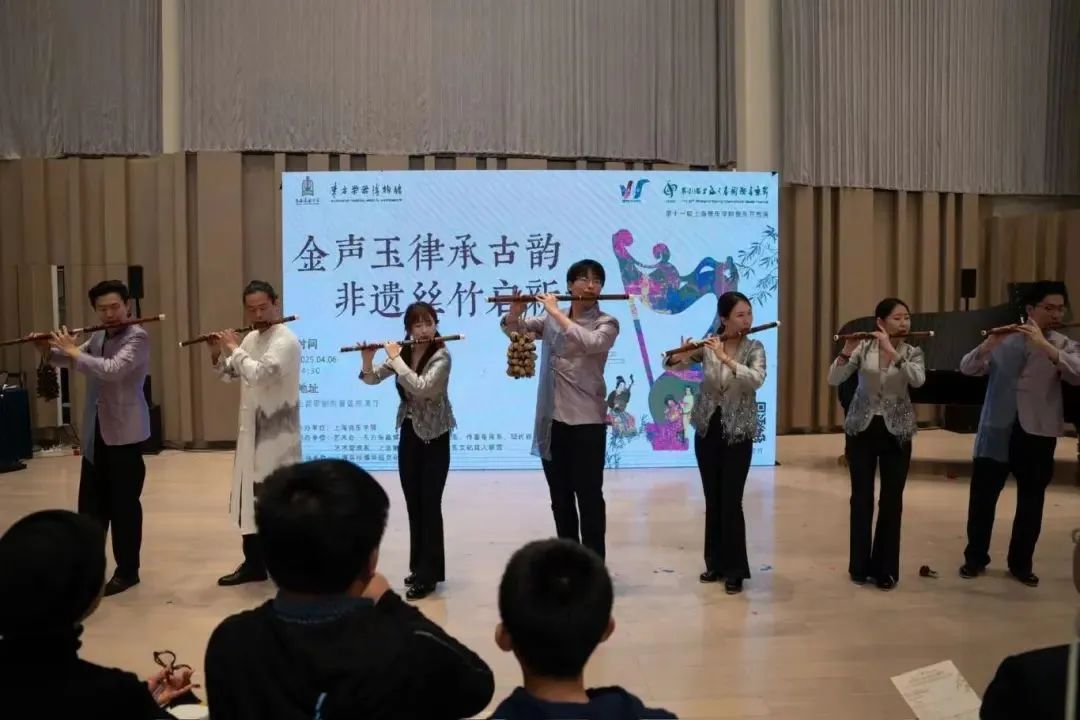 当天下午,悠扬的骨笛声拉开了“金声玉律承古韵非遗丝竹启新章”音乐会的序幕。上海音乐学院中国竹笛乐团成员们跳着踢踏舞、衔着玫瑰,以跨界融合风演绎了竹笛重奏作品《玫瑰玫瑰LOVE》,耳目一新的形式赢得了观众热烈的掌声。《月光爱人·璀璨》在八位中国竹笛乐团成员的深情演奏下,让观众仿佛漫步于月光皎洁的沙滩,心绪随着波涛潮起潮落。